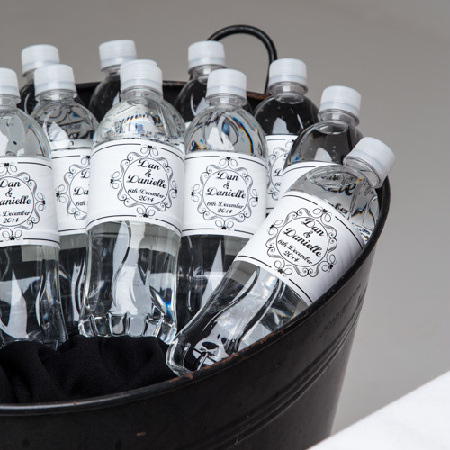 Personalized Water Bottle Labels - Personalization Mall Item # 18921 Personalize with couple's titles, last name and one additional line of personalization Choose from four color options Please Note: design is printed and not actual glitter Sold in sets of 24 Labels are self-adhesive and waterproof Labels measure 8 1/2" x 2" Fits most standard 12 oz. and 16.9 oz. water bottles.